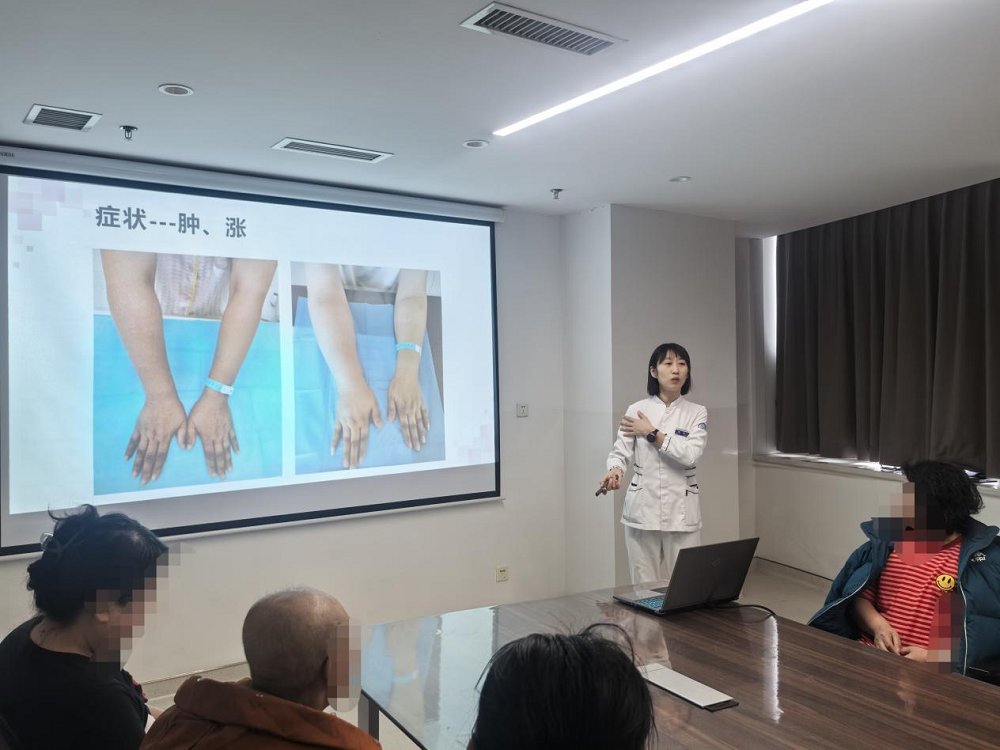 3月5日,乳腺外三科護(hù)士長王鶴為患者及家屬講解了“淋巴水腫的預(yù)防與護(hù)理”相關(guān)知識,并強(qiáng)調(diào)早期預(yù)防淋巴水腫和干預(yù)的重要性,從生活中的點滴舉例,讓大家對于淋巴水腫有深刻的認(rèn)知并重視起來。主管護(hù)師張月為大家講解“化療期間便秘的預(yù)防”要做到飲食均衡、適當(dāng)運(yùn)動、作息規(guī)律,還要增加膳食纖維的攝入,增加飲水量等。