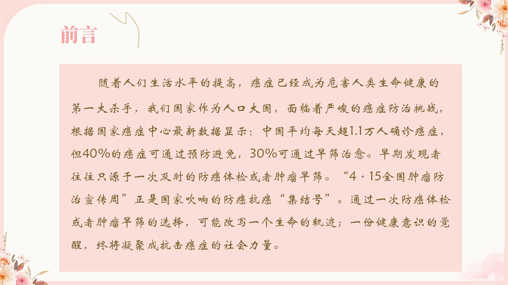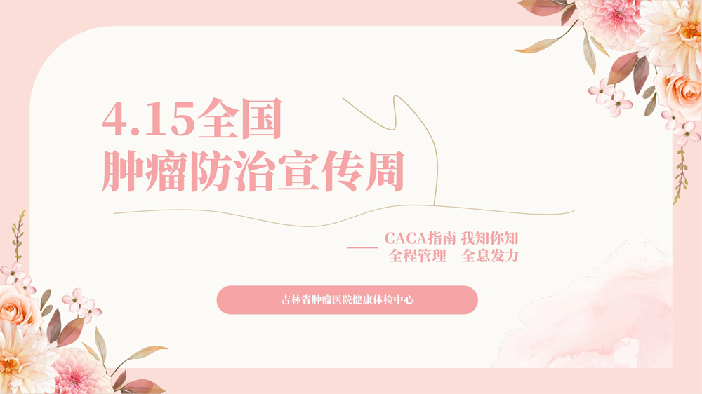 當(dāng)前位置:首頁 > 醫(yī)院新聞 > 最新資訊 4.15全國腫瘤防治宣傳周--CACA指南 我知你知 全程管理 全息發(fā)力 來源: 時間:2025-04-11 瀏覽: 次 來源:吉林省腫瘤醫(yī)院健康體檢中心統(tǒng)稿編輯:宣傳統(tǒng)戰(zhàn)科初審人:陳靖石復(fù)審人:賈春祎終審人:梁長林
