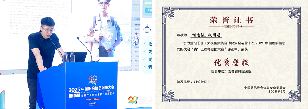 信息管理中心網(wǎng)絡(luò)安全工程師劉遠征創(chuàng)作的《基于大模型賦能自動化安全運營》榮獲“優(yōu)秀壁報獎”,并受邀在論壇上進行專題分享。該研究聚焦醫(yī)療數(shù)據(jù)安全領(lǐng)域,通過結(jié)合大語言模型(LLM)與自動化運維技術(shù),探索構(gòu)建了一套智能化安全監(jiān)測與響應(yīng)系統(tǒng),該系統(tǒng)能夠顯著提升醫(yī)院網(wǎng)絡(luò)安全的實時防護能力。