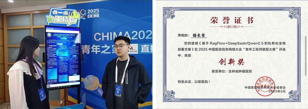 信息管理中心工程師駱長安的壁報《基于RagFlow+DeepSeek/Qwen2.5的私有化全棧部署方案》榮獲“創(chuàng)新獎”,并接受現(xiàn)場采訪。該方案針對醫(yī)療行業(yè)對數(shù)據(jù)隱私的高要求,提出了一套完整的本地化大模型部署框架,實現(xiàn)了從數(shù)據(jù)處理、模型訓(xùn)練到應(yīng)用落地的全流程閉環(huán),能夠為醫(yī)院智能化建設(shè)提供安全、高效的解決方案。