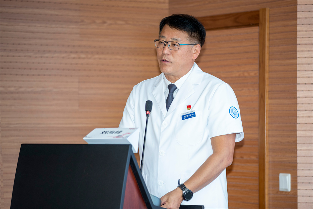 吉林省腫瘤醫(yī)院黨委書(shū)記劉海峰致辭。劉海峰書(shū)記在致辭中指出,此次外科周手術(shù)視頻直播活動(dòng),是醫(yī)院黨建與外科業(yè)務(wù)工作的一次深度融合,也是我院助推外科高質(zhì)量發(fā)展的重要舉措。他表示,醫(yī)院在省內(nèi)率先引進(jìn)達(dá)芬奇手術(shù)機(jī)器人系統(tǒng),開(kāi)展以胸腔鏡、腹腔鏡、宮腔鏡為代表的微創(chuàng)技術(shù),為眾多復(fù)雜疑難腫瘤患者帶來(lái)了新的希望。同時(shí),醫(yī)院高度重視外科的學(xué)科建設(shè),乳腺腫瘤外科獲批國(guó)家臨床重點(diǎn)??疲夭磕[瘤外科、腹部腫瘤外科先后獲批省級(jí)臨床重點(diǎn)專科。他希望各位觀看直播的同仁,能夠通過(guò)相互學(xué)習(xí)、相互借鑒,不斷提升自己的業(yè)務(wù)能力和技術(shù)水平,為患者提供更加優(yōu)質(zhì)、高效的醫(yī)療服務(wù)。
