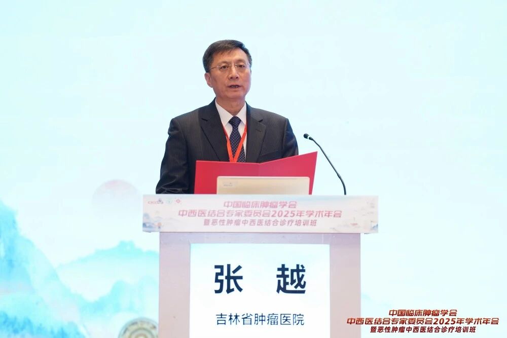 開幕式上,張越教授立足全球腫瘤診療視野發(fā)表致辭,深刻闡釋了中西醫(yī)結(jié)合“理念融合與臨床創(chuàng)新”的核心內(nèi)涵,分享了吉林省腫瘤醫(yī)院中西醫(yī)協(xié)同治療惡性腫瘤的實踐成果,為會議錨定發(fā)展方向,獲全場專家高度認同;會議尾聲,他作總結(jié)梳理形成三大核心共識,即肯定中西醫(yī)結(jié)合在免疫相關(guān)不良反應(yīng)、腫瘤并發(fā)癥管理中的獨特價值,明確臨床標準化、證據(jù)體系構(gòu)建是學(xué)科發(fā)展核心任務(wù),提出以“中國智慧”推動中西醫(yī)結(jié)合診療國際化輸出,同時介紹學(xué)會下一步將聯(lián)合全國頂尖機構(gòu)開展多中心臨床研究、撰寫規(guī)范化診療共識,推動學(xué)科高質(zhì)量發(fā)展。